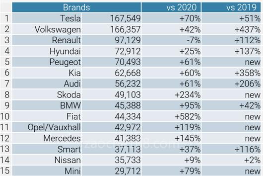 2021年歐洲電動(dòng)車(chē)銷(xiāo)量品牌榜