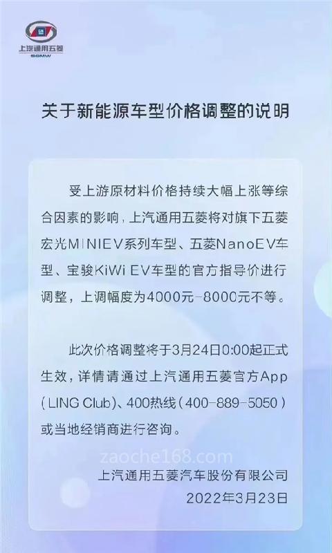 3月23日,五菱汽車在官方微博發(fā)布了關(guān)于一條關(guān)于新能源車型價格調(diào)整的說明。提出將對旗下宏光MINIEV、五菱NanoEV、寶駿KiWiEV等車型的官方指導(dǎo)價進(jìn)行上調(diào),幅度為4000元-8000元不等,于3月24日0:00起正式生效。