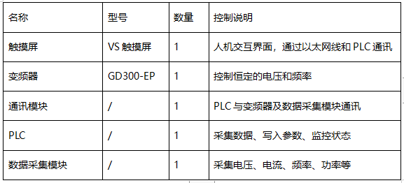 配合系統(tǒng):英威騰VS-070HS觸摸屏、友商PLC、通訊模塊、通訊板、電力采集模塊及其它輔材斷路器、繼電器等。