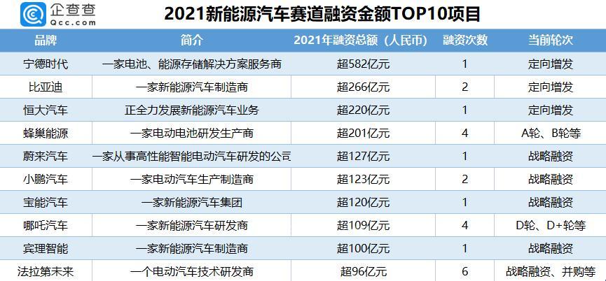 2021新能源汽車賽道融資金額TOP10項(xiàng)目;圖片來源:企查查