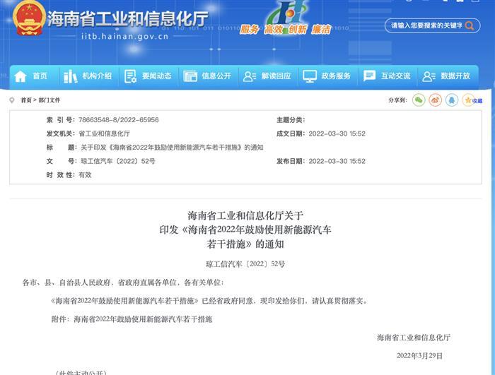 3月30日,海南省工信廳29日印發(fā)《海南省2022年鼓勵(lì)使用新能源汽車若干措施》?!洞胧饭膭?lì)個(gè)人及其他領(lǐng)域使用新能源汽車。2022年1月1日至12月31日,在汽車使用環(huán)節(jié),對(duì)在海南省個(gè)人及其他領(lǐng)域(不含上文已申領(lǐng)補(bǔ)貼的)購買新能源汽車新車并在省內(nèi)注冊(cè)登記的,在可提供核算充電量的情況下,自車輛注冊(cè)登記起一年內(nèi)充電量大于2000度(含)每輛可申領(lǐng)2000元充電費(fèi)用補(bǔ)貼,小于2000度每輛可申領(lǐng)1500元充電費(fèi)用補(bǔ)貼。