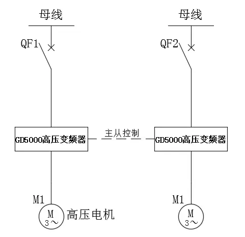 兩臺Goodrive5000變頻器通過主從通訊連到一起,主機跑速度模式,從機跑轉矩模式,從而保證兩臺機組出力一樣,兩臺機組動態(tài)響應更加協(xié)調,使機組運行更加穩(wěn)定可靠。