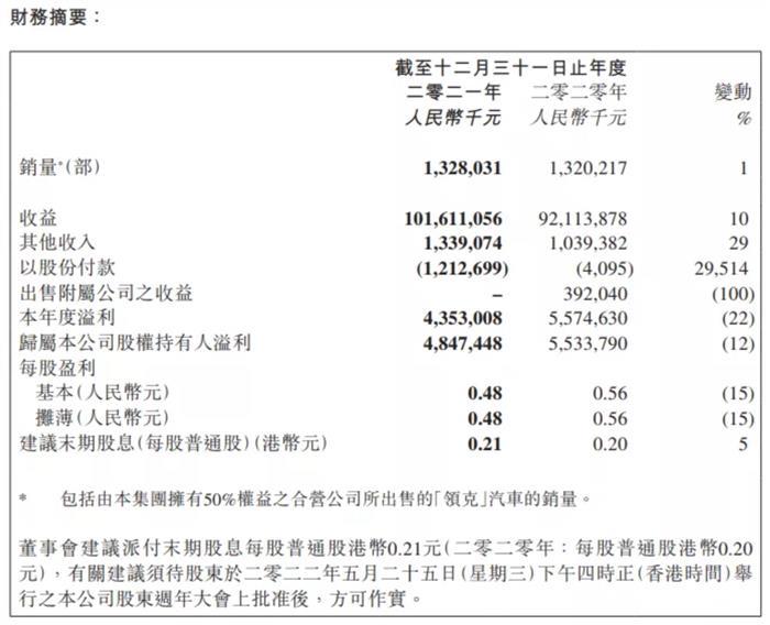 吉利汽車2021年全年實(shí)現(xiàn)營收1016億元,同比增長(zhǎng)10.3%,繼2018年后再度實(shí)現(xiàn)營收超千億大關(guān)。盈利方面,吉利汽車扣除股份支付的股東應(yīng)占溢利為60.6億元,同比增長(zhǎng)9.4%;研發(fā)投入為55億元,同比增長(zhǎng)16.1%;歸屬公司股權(quán)持有人溢利和年度溢利分別為48.5億元和43.5億元,分別同比下滑12.3%和21.9%。
