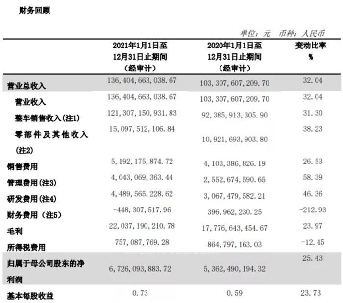2021 年,長(zhǎng)城汽車銷售新車128.1萬輛,同比增長(zhǎng)14.8%;實(shí)現(xiàn)營業(yè)收入1364.1億元,同比增長(zhǎng)32%;毛利率為16.2%,比前年同期減少了1.05個(gè)百分點(diǎn);研發(fā)費(fèi)用為44.9億元,同比增長(zhǎng)46.4%;歸屬于母公司股東的凈利潤為67.3億元,同比增長(zhǎng)25.4%。