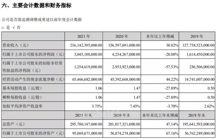 比亞迪2021年實(shí)現(xiàn)營業(yè)收入2161.42億元,同比增長(zhǎng)38.02%;其中汽車業(yè)務(wù)收入為1124.89億元,同比增長(zhǎng)33.93%,占總營業(yè)收入的52.04%;歸屬于上市公司股東的凈利潤為30.45億元,同比下滑28.08%。