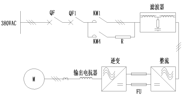 本次英威騰的方案,主回路主要由用戶開(kāi)關(guān)QF,變頻器輸入主斷路器QF1,緩沖接觸器KM4,主回路接觸器KM1,LCL濾波器,整流單元,逆變單元以及輸出電抗器幾部分組成。
