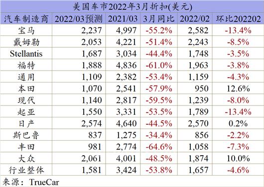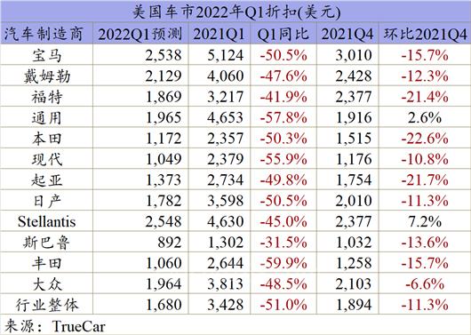 LMC和JD Power表示,3月美國(guó)新車的平均優(yōu)惠金額達(dá)到1,044美元的歷史新低,同比下跌69%。TrueCar則預(yù)計(jì),一季度的平均優(yōu)惠金額同比下降51%至1,680美元,其中3月更是同比下降54%至1,581美元。