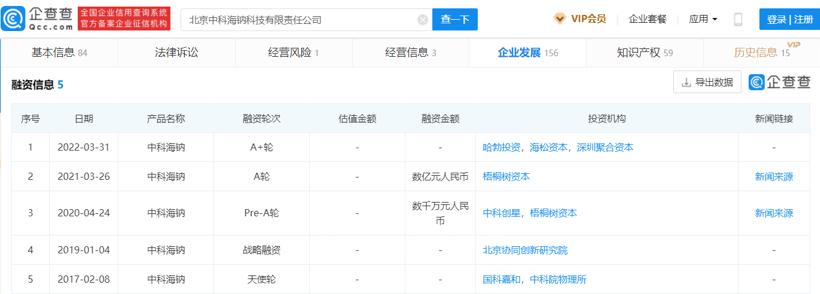 中科海納融資信息,圖片來源:企查查