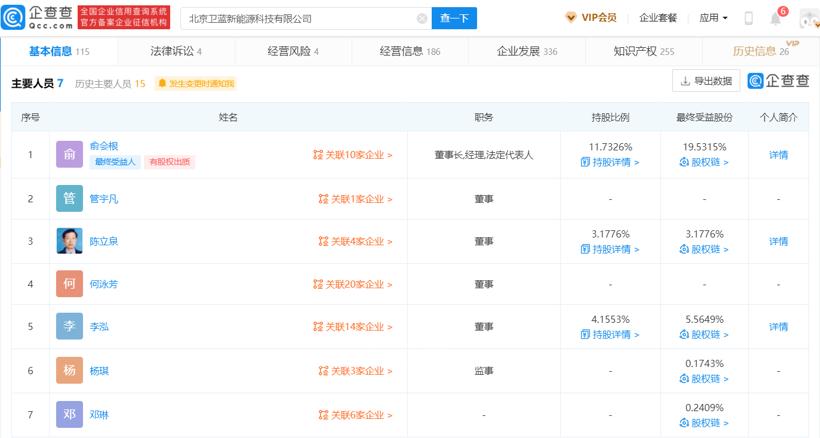 衛(wèi)藍新能源主要人員,圖片來源:企查查