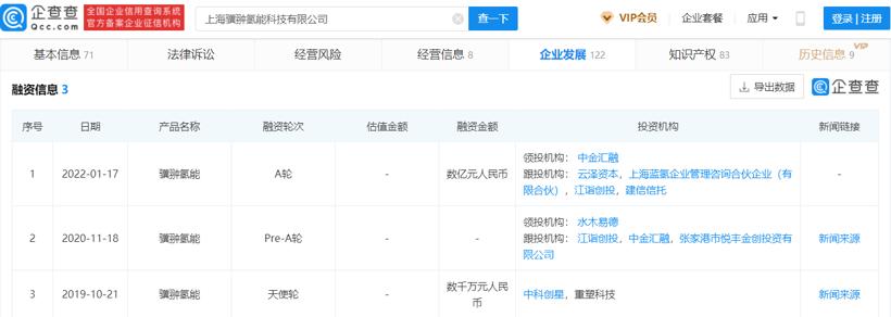 驥翀氫能融資信息,圖片來源:企查查