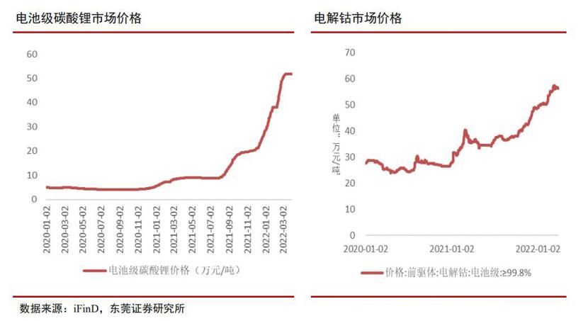 最新數(shù)據(jù)顯示,截至2022年3月30日,電池級碳酸鋰報價51.75萬元/噸,較年初上漲了80%,較去年同期上漲近5倍;電解鈷報價56.25萬元/噸,較年初上漲15%,較去年同期上漲59%;電解鎳價格為21.94萬元/噸,較年初上漲42.9%,較去年同期上漲78.7%。