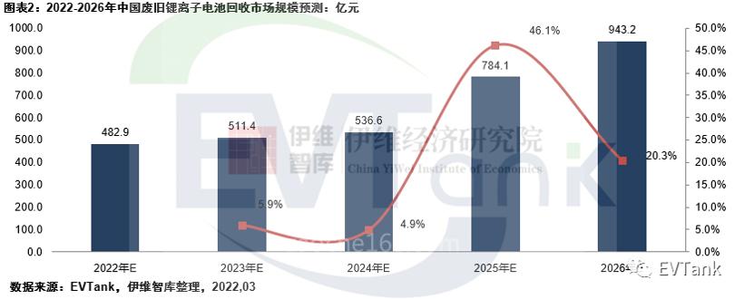 根據(jù)EVTank的預測,2026年中國理論廢舊鋰離子電池回收量將達到231.2萬噸,理論市場規(guī)模將達到943.2億元。