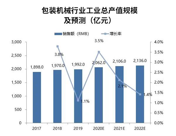 2020年包裝機(jī)械行業(yè)工業(yè)總產(chǎn)值為2062億元人民幣,包裝機(jī)械市場(chǎng)需求量有一定上漲,增長(zhǎng)率為3.5%,預(yù)計(jì)2021年包裝機(jī)械行業(yè)市場(chǎng)需求會(huì)在雙循環(huán)的帶動(dòng)下保持低速增長(zhǎng)。