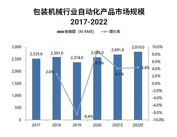 2020年包裝機(jī)械使用的自動(dòng)化產(chǎn)品的市場(chǎng)規(guī)模約為25.85億元。
