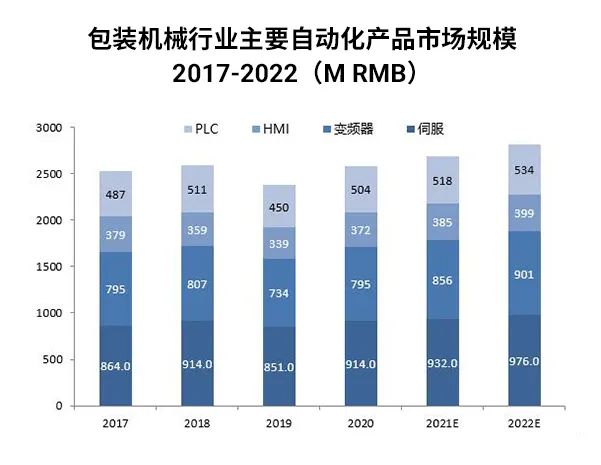 包裝機(jī)械自動(dòng)化產(chǎn)品以伺服、變頻器、HMI、PLC為主,2020年包裝機(jī)械行業(yè)應(yīng)用的自動(dòng)化產(chǎn)品伺服、變頻器、HMI、PLC的市場(chǎng)規(guī)模分別為9.14億元、7.95億元、3.72億元、5.04億元。