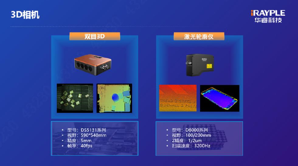 針對3D產(chǎn)品,全新發(fā)布了雙目3D和激光輪廓儀。雙目3D采用了優(yōu)越的光學(xué)設(shè)計,抑制環(huán)境光能力強;內(nèi)置深度學(xué)習(xí)引擎,實時輸出物體3D坐標(biāo),實現(xiàn)實時檢測;可處理毫米級低包裹,幀率高。廣泛應(yīng)在在單件分離、無序抓取和量方測量等方面。激光輪廓儀,提供精確點云圖和2D深度圖,Z方向重復(fù)精度可達1.2μm,掃描數(shù)據(jù)更穩(wěn)定;支持多臺相機拼接,可應(yīng)用在輪胎字符識別,PIN針缺陷、有無檢測、工件平整度檢測等。