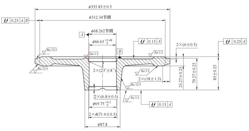 鏈輪是工程機(jī)械常用驅(qū)動裝置的重要零部件之一,其加工質(zhì)量直接影響整機(jī)的裝配質(zhì)量及使用壽命。我廠在鏈輪試制過程中,首批投入15件毛坯,機(jī)械加工完成后,進(jìn)行成品全尺寸檢測,檢測結(jié)果:小端孔口軸向圓跳動超差率6.67%,大端孔口軸向圓跳動超差率13.33%,大端齒部軸向圓跳動超差率33.33%,總長尺寸(83±0.25)mm,約86.67%超出上極限。分析認(rèn)為,總長尺寸超出上極限為感應(yīng)淬火工序齒部變形所致。針對鏈輪軸向圓跳動超差的原因分析及相應(yīng)的工藝驗證做了如下具體工作。