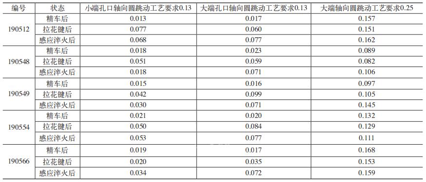 表2 感應(yīng)淬火工序前后軸向圓跳動檢測數(shù)據(jù) (單位:mm)