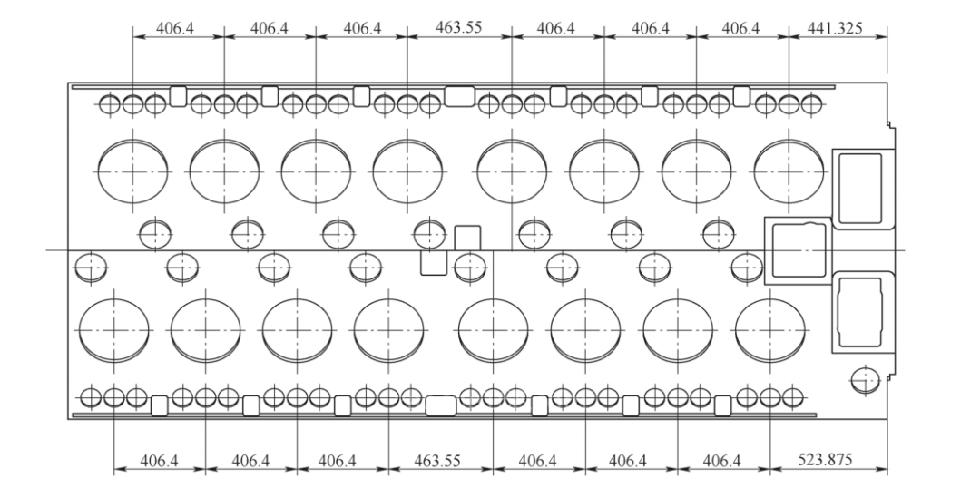 RK270型船用柴油機的標定功率為5500kW,其功率大,質量輕,技術先進,經(jīng)濟性好,大修周期長,是國際先進的大功率中速柴油機。曲軸箱是柴油機的關鍵部件,工作時承受氣體壓力、慣性力及慣性力矩的共同作用,應具有高的蠕變強度與持久強度。曲軸箱氣缸軸線V形夾角為45°,每側分布8個精密氣缸孔,用于放置氣缸套。氣缸孔位置如圖1所示。氣缸孔作為曲軸箱的重要部位,其加工精度對柴油機的工作效率影響很大,柴油機工作時,活塞環(huán)在氣缸套內(nèi)高速運動,氣缸孔的圓柱度、垂直度、表面粗糙度以及止口的平行度都影響柴油機的性能。
