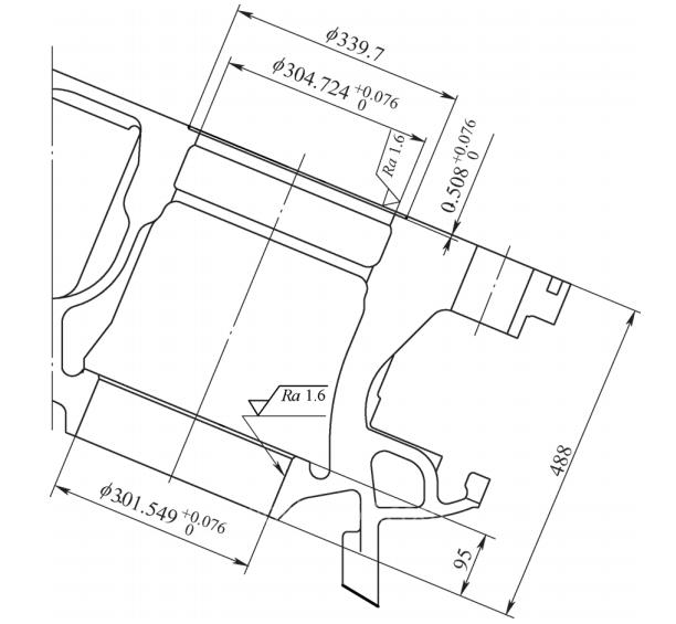 圖2為氣缸孔,其與止口之間的尺寸公差、幾何公差要求很嚴格,氣缸孔表面粗糙度值Ra要求達到1.6μm,表面不能有振紋,但是使用加長鏜刀加工氣缸孔二環(huán)時,由于刀具長度達530mm,所以加工時常發(fā)生振動,影響表面粗糙度,而減小進給量則會降低加工效率。止口的公差要求嚴格,需要與氣缸孔在一臺設備上一次裝夾來完成,這樣可以解決垂直度、軸向圓跳動的問題。