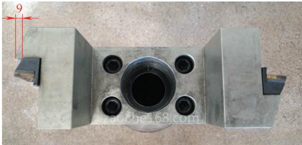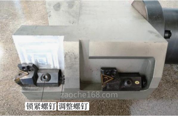 (2)粗鏜復合刀具改進及切削參數(shù)設定 粗鏜氣缸孔時,由于氣缸孔二環(huán)鑄造毛坯余量太大,定制的粗鏜復合刀具不能一次完成粗加工,還需要用雙刃鏜刀加工兩次,影響加工效率。根據(jù)用刀經(jīng)驗,提出了刀具改進方案(見圖5),將加工氣缸孔二環(huán)的其中一個切削刃所在的刀座向刀具中心偏移銑削9mm(見圖5a),在安裝刀夾時,松開鎖緊螺釘(見圖5b),轉動調整螺釘,將該切削刃向進給切削方向調長1mm,再擰緊鎖緊螺釘,這樣可以增加切削深度9mm。經(jīng)過改進,粗加工氣缸孔可一次完成。
