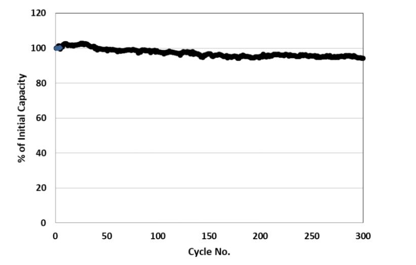 圖 1:使用Electrovaya專有固態(tài)混合電池技術(shù)的多個樣品的容量保持率。紐扣電芯樣品在室溫和100% DOD下以C/5速率循環(huán),循環(huán)300次后的容量保持率約為94%。