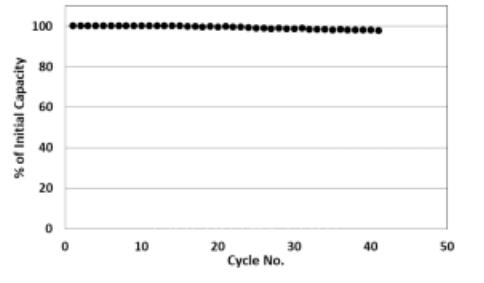 圖 2:使用Electrovaya專有固態(tài)混合電池技術(shù)的軟包電池的容量保持率。樣品在室溫和100% DOD下以C/5速率循環(huán),未對電芯施加外部壓力。