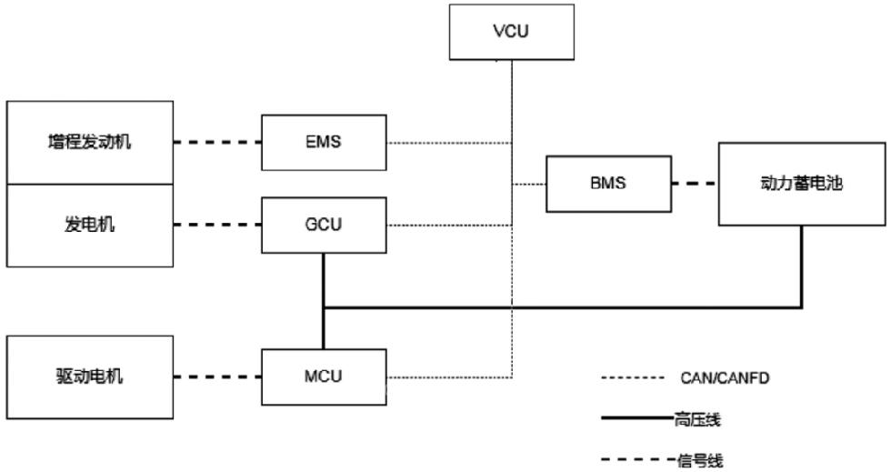 增程式電動(dòng)汽車整車控制系統(tǒng)主要由增程器發(fā)動(dòng)機(jī)控制單元(EMS)、發(fā)電機(jī)控制單元(GCU)、驅(qū)動(dòng)電機(jī)控制單元(MCU)、動(dòng)力蓄電池管理單元(BMS)、具備增程器協(xié)調(diào)控制的整車控制單元(VCU)和CAN/CANFD網(wǎng)絡(luò)通信系統(tǒng)組成。增程式電動(dòng)汽車整車控制系統(tǒng)原理,如圖1所示。