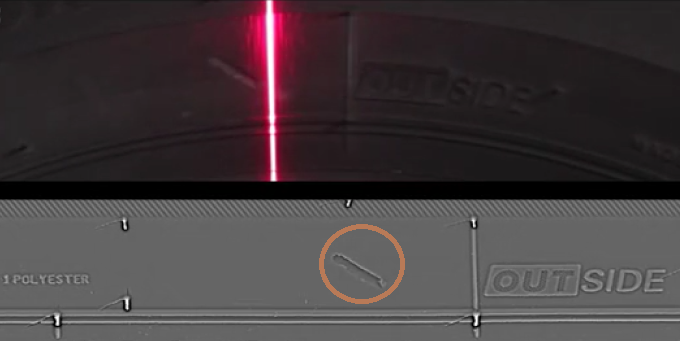 在上圖架設(shè)條件下,相機(jī)對(duì)輪胎采集圖像可達(dá)到的幀率約為18KHz,Y方向(運(yùn)動(dòng)方向)設(shè)置分辨率為0.2mm,則折算成線速度為18K * 0.2 = 3600 mm/s,因此最快可在約0.5s的時(shí)間內(nèi)完成輪胎一周的掃描。