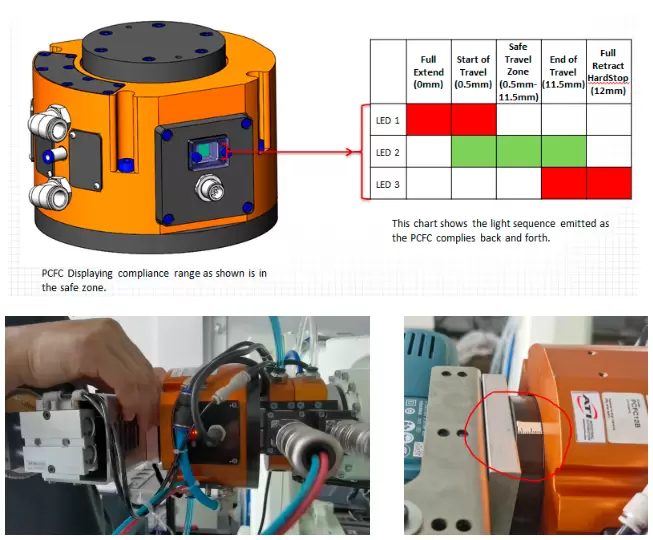 位置顯示功能,需要提前校準(zhǔn),校準(zhǔn)后,位置信息會(huì)通過(guò)PCFC上的指示燈做初步顯示,便于調(diào)試的時(shí)候觀察。另外也會(huì)通過(guò)模擬量信號(hào),告訴機(jī)器人控制柜或者PLC,具體浮動(dòng)所停留的位置,以便編程和控制。
