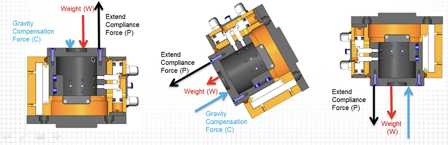 圖片中,W 工具自重(Weight),P設(shè)置壓力(Extend Compliance Force),C 工具重力補(bǔ)償(Gravity Compensation )。PCFC的工具自重補(bǔ)償,基本原理是,PCFC內(nèi)置一個(gè)MCU(微控制器),可以通過(guò)內(nèi)置的陀螺儀加速計(jì)采集到工具的空中姿態(tài)變化數(shù)據(jù),然后MCU計(jì)算出需要多大的氣壓來(lái)補(bǔ)償工具的重量,并通過(guò)發(fā)出模擬量調(diào)控電子比例閥,來(lái)調(diào)整輸出壓力,從而給工具的自重歸零。