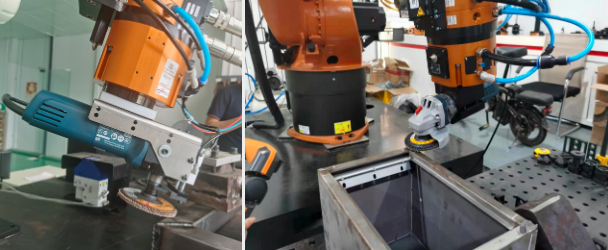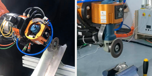 拼焊后的平面焊縫打磨,電動(dòng)角磨機(jī)和PCFC垂直安裝。配的磨具是彈性百葉盤,用的是百葉盤的端面打磨,百葉盤在做軸向浮動(dòng)。百葉盤彈性磨料,打磨出表面,過(guò)度更平滑,也可以讓機(jī)器人打磨的容錯(cuò)性更高。