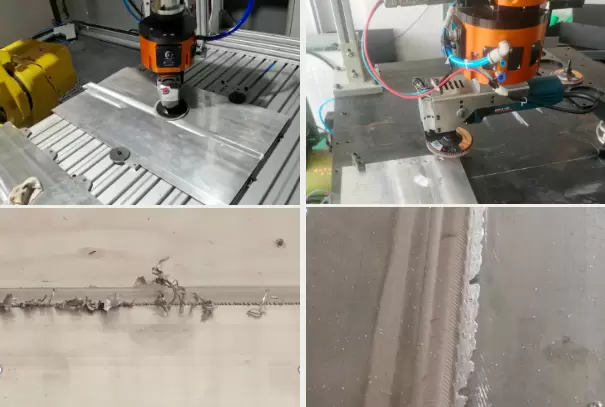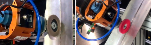 弧焊拼焊后,拐角區(qū)域的焊縫需要簡(jiǎn)單清理。利用百葉盤磨具的外圓部分,配合PCFC的軸向浮動(dòng),可以完成恒力打磨。