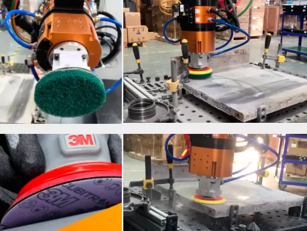 角磨機(jī)可自動(dòng)更換砂碟,采用類似于電主軸錐形刀柄的方式。先把磨具砂碟裝在夾具上,夾具上有個(gè)錐形連接口,可以和角磨機(jī)自動(dòng)連接,擺放好后相當(dāng)于一個(gè)磨具庫(kù)。通常一個(gè)砂碟的壽命在十幾或幾十分鐘,所以需要新舊更換。另外也有需要不同粒度更換的情況,因此自動(dòng)化打磨都需要一個(gè)磨具庫(kù),跟CNC機(jī)床的刀具庫(kù)是類似的。