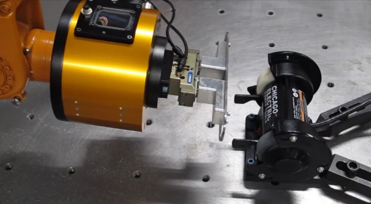 夾具固定在PCFC上,PCFC再固定在機(jī)器人末端,然后抓著工具去靠近打磨工具。在打磨的壓力方向上,有PCFC浮動(dòng),可以實(shí)現(xiàn)恒力打磨。