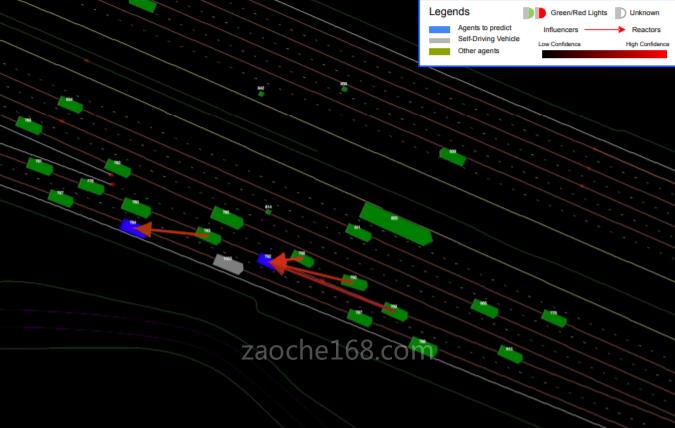 第二個(gè)預(yù)測(cè)模型,稱為條件預(yù)測(cè)器,會(huì)根據(jù)通過(guò)代理的動(dòng)作猜測(cè)讓行代理的動(dòng)作。該系統(tǒng)為讓行者和通過(guò)者預(yù)測(cè)許多不同的軌跡,分別計(jì)算每個(gè)軌跡的概率,然后選擇發(fā)生可能性最高的六個(gè)聯(lián)合結(jié)果。