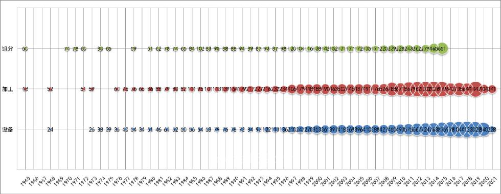 上圖還同時(shí)從產(chǎn)業(yè)鏈的角度顯示了鎂鋁合金汽車輕量化應(yīng)用技術(shù)三個(gè)環(huán)節(jié)的專利發(fā)展趨勢(shì)。三個(gè)環(huán)節(jié)分別為材料組分、材料和部件加工和專用設(shè)備。