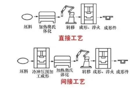 將常溫下的普通高強(qiáng)度鋼在步進(jìn)爐中加熱到880-950℃,將材料組織均勻奧氏體化,然后送入帶有冷卻系統(tǒng)的模具內(nèi)沖壓成型,最后快速冷卻,將奧氏體轉(zhuǎn)變?yōu)轳R氏體,使沖壓件得到硬化,這時材料強(qiáng)度得以大幅度提高,這個過程被稱為“沖壓硬化”。熱成型工藝分為兩種,分別是直接工藝與間接工藝,兩種大致相同。
