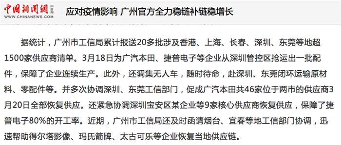 上述報道中提到,廣州市工信局在3月18日為廣汽本田、捷普電子等企業(yè)從深圳管控區(qū)搶運出一批配件,保障了企業(yè)連續(xù)生產(chǎn)。此外,還調(diào)集無人車,隨時待命,赴深圳、東莞閉環(huán)運輸原材料、零配件等。并多次協(xié)調(diào)深圳、東莞工信部門,促成廣汽本田共46家位于兩市的供應(yīng)商3月20日全部恢復(fù)供應(yīng)。還緊急協(xié)調(diào)深圳寶安區(qū)某企業(yè)等9家核心供應(yīng)商恢復(fù)供應(yīng),保障了捷普電子80%的開工率。