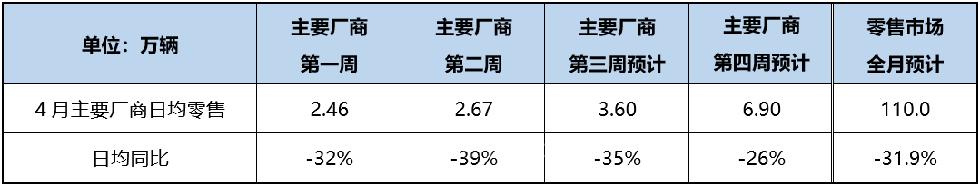 近日,乘聯(lián)會(huì)對(duì)4月狹義乘用車零售做了預(yù)測(cè),零售市場(chǎng)將在110.0萬(wàn)輛左右,同比下降31.9%,環(huán)比下降30.3%。其中,4月第一、二周汽車零售受到生產(chǎn)停滯、終端閉店等影響較大,日均零售分別為2.46萬(wàn)輛、2.67萬(wàn)輛,日均同比分別下滑32%、39%。