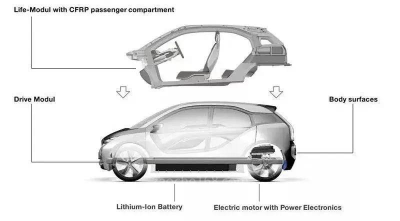 而輕量化的亮點(diǎn)就在于在“Life”部分大量使用了CFRP材料,即碳纖維復(fù)合材料,這是一種被大量用于F1賽車,航空領(lǐng)域的材料,而且分成Life和Drive兩部分,能夠分別控制車身材料成本與電池組的成本,做到兩者的一個(gè)合理分配。