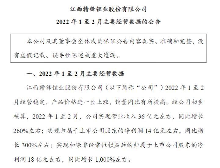 贛鋒鋰業(yè)關(guān)于1至2月主要經(jīng)營數(shù)據(jù)的公告;圖片來源:贛鋒鋰業(yè)公告截圖