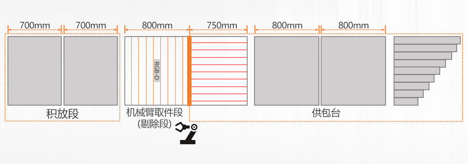 機(jī)械臂取件段(剔除段):包裹識別抓取區(qū)域,并負(fù)責(zé)將異形件進(jìn)行剔除