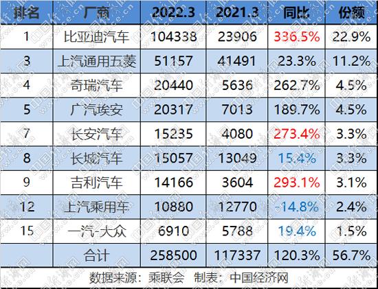 受疫情和芯片短缺的影響,國內(nèi)乘用車市場(chǎng)在今年一季度的表現(xiàn)明顯不及預(yù)期。不過,新能源乘用車卻依舊延續(xù)高增長(zhǎng)態(tài)勢(shì)。數(shù)據(jù)顯示,3月,乘用車市場(chǎng)批發(fā)銷量達(dá)181.4萬輛,同比下降1.6%;1-3月,累計(jì)批發(fā)銷量達(dá)到543.9萬輛,同比增長(zhǎng)8.3%。3月,新能源乘用車批發(fā)銷量45.5萬輛,同比增長(zhǎng)122.4%;1-3月新能源乘用車批發(fā)119.0萬輛,同比增長(zhǎng)145.4%。