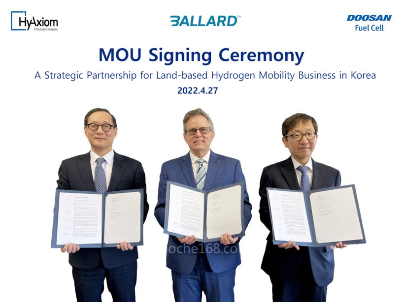 斗山燃料電池公司及斗山公司的全資北美子公司HyAxiom,已在康涅狄格州(HyAxiom的總部所在地)與巴拉德公司簽署了一份理解備忘錄,將把巴拉德的核心PEM技術(shù)整合到動(dòng)力總成中,用以開(kāi)發(fā)氫燃料電池動(dòng)力汽車。