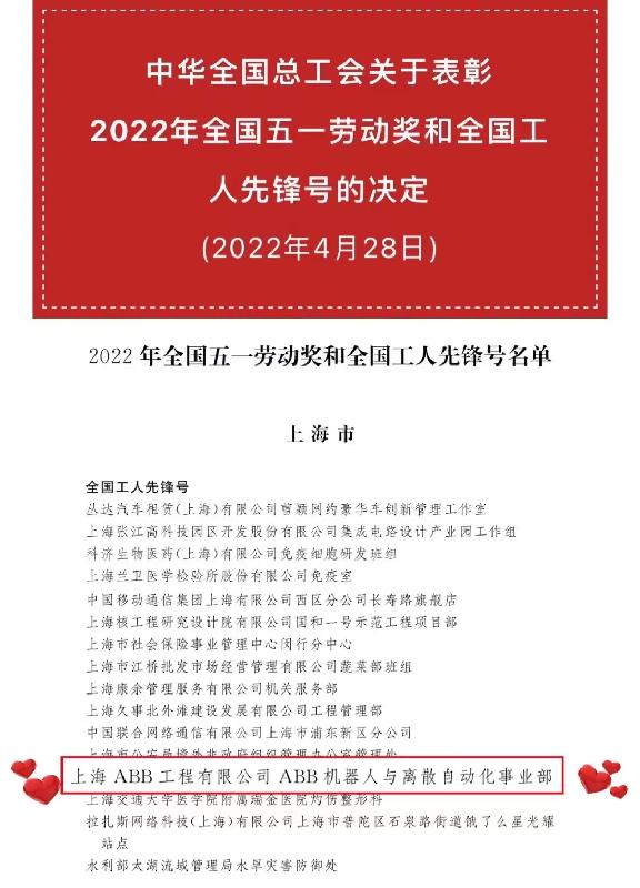 為進一步增強新時代工人階級的自豪感和使命感,營造勞動光榮的社會風(fēng)尚和精益求精的敬業(yè)風(fēng)氣,4月28日,中華全國總工會公布了2022年全國五一勞動獎和全國工人先鋒號名單,上海ABB工程有限公司ABB機器人與離散自動化事業(yè)部榮獲 “全國工人先鋒號”光榮稱號!