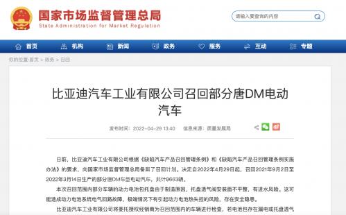 4月29日消息,日前,比亞迪汽車(chē)工業(yè)有限公司根據(jù)《缺陷汽車(chē)產(chǎn)品召回管理?xiàng)l例》和《缺陷汽車(chē)產(chǎn)品召回管理?xiàng)l例實(shí)施辦法》的要求,向國(guó)家市場(chǎng)監(jiān)督管理總局備案了召回計(jì)劃。決定自2022年4月29日起,召回2021年9月2日至2022年3月14日生產(chǎn)的部分唐DM車(chē)型電動(dòng)汽車(chē),共計(jì)9663輛。