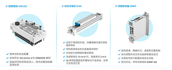 Festo一站式自動(dòng)化解決方案為四類典型工藝:自動(dòng)搬運(yùn)、壓裝成型、自動(dòng)裝配、平衡助力,提供高效精確的軟硬件產(chǎn)品,助生產(chǎn)商打造核心競(jìng)爭(zhēng)優(yōu)勢(shì)。