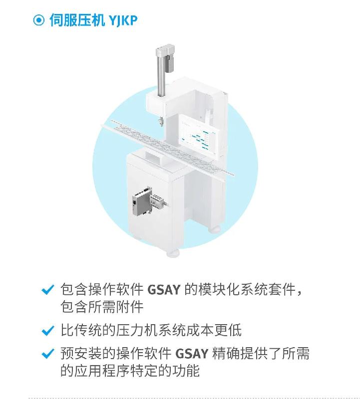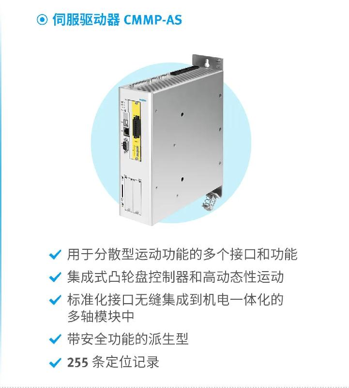 費(fèi)斯托伺服壓機(jī)YJKP,由伺服驅(qū)動(dòng)器CMMP-AS、馬達(dá) EMMS/E-AS、控制器 CECC-X及電缸ESBF組成,通過后臺(tái)控制軟件編程工藝參數(shù),達(dá)到整個(gè)運(yùn)動(dòng)曲線的完美平衡。