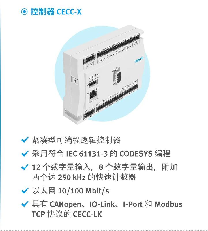 費(fèi)斯托為自動(dòng)裝配流程提供伺服驅(qū)動(dòng)器CMMO-ST、馬達(dá)EMMS-ST、總線通訊模塊CTEU、控制器 CECC、電驅(qū)動(dòng)轉(zhuǎn)臺(tái)ERMB/H、氣動(dòng)轉(zhuǎn)臺(tái)DHTG等豐富的元件組合。依靠平臺(tái)化閥島可將整個(gè)氣動(dòng)和電驅(qū)執(zhí)行反饋,打通所有信號(hào)的傳遞,實(shí)現(xiàn)所有現(xiàn)場(chǎng)執(zhí)行單元的數(shù)字化,為上云提供可靠詳盡的現(xiàn)場(chǎng)數(shù)據(jù)。